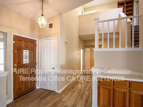 Welcome to this stunning 4-bedroom, 3-bathroom home located in the heart of Murrieta, CA. This property boasts a range of modern amenities including a dishwasher, a cozy fireplace, and a large backyard perfect for outdoor activities. The interior features brand new carpeting, adding a touch of comfort and luxury. The house also includes a spacious dining room and a family room, providing ample space for entertaining guests. The master suite is a true retreat with his & her sinks and a walk-in closet. The custom paint throughout the home adds a unique touch of elegance. The laundry room comes equipped with washer and dryer hookups for your convenience. The home also features a ceiling fan for those warm California days and a formal dining room for special occasions. This home is a perfect blend of style, comfort, and convenience. Gardener is provided for the front yard only. Tenant responsible for backyard.