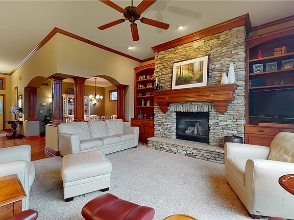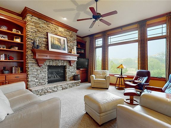 with custom-built posts. Great room with floor-to-ceiling stone fireplace with custom-built mantel and oversized windows showing off