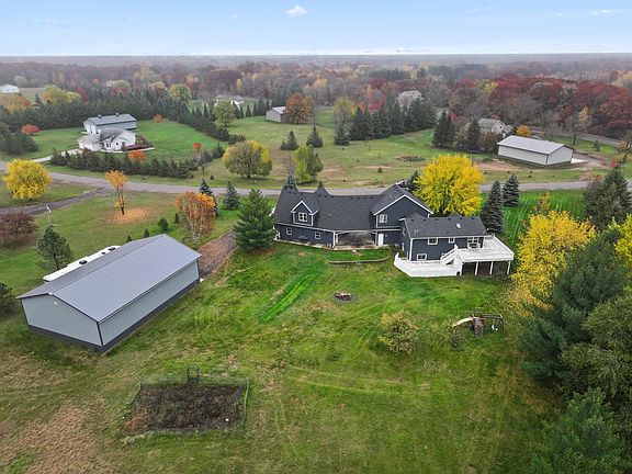 Here's your chance to own a customized home that no one else will have. The original home was added onto, giving it a huge primary owners suite above the garage, complete with its own laundry and private bathroom. The extra 4 car garage is finished/heated/ac with 1/2 bath/car hoist. Above the garage gives 945 FSF with dry bar and 3/4 bathroom. Makes for a great entertainment space/home office or extra living quarters. Renovate the whole garage up and down to create the ultimate In-Law Suite or potential home business!! The 2 tiered deck and covered patio provides more than enough room when entertaining. The 40x60 pole shed has a 14 foot door and concrete floor with floor drain. Large backyard is perfect for the kids and dogs to run and have a huge garden. All of this on 2.3 acres and a natural gas line. 20 minutes from the cities. You won't see another property like this.