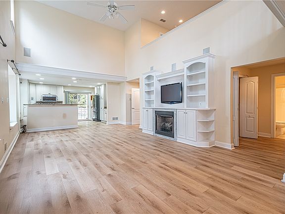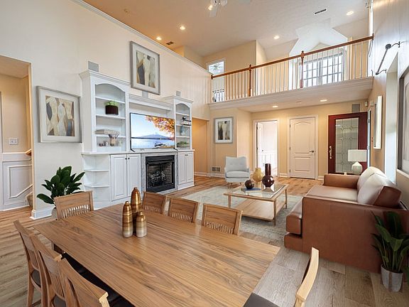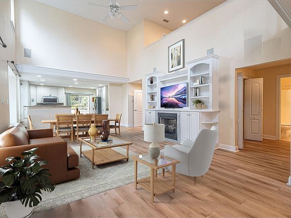 Welcome to this stunning 3-bedroom end unit condo, featuring a bright two-story familyroom that creates an inviting atmosphere. The living area boasts new LVT flooring, creating a modern, sleek surrounding. The updated kitchen features a stylish ceramic backsplash, quartz countertops, and newer appliances, including a gas range. A 1st floor den/office with built-in bookcases adds a functional touch. The first-floor owner's suite includes an updated bath with a quartz double vanity and a ceramic shower, providing a luxurious retreat. A covered rear patio, and a beautiful landscape allows for outdoor relaxation and entertaining. Upstairs, a spacious loft complements two additional bedrooms and abundant storage, ensuring ample space for all needs. This home blends style, convenience, and comfort in a desirable location.