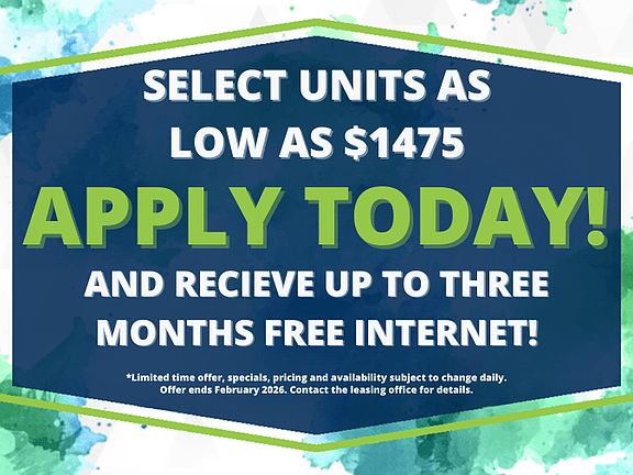 - Special offer! Receive up to a $2760 in Rent Credit on a 12 month lease! (select units only) *Limited time offer, specials, pricing and availability subject to change daily. Contact the leasing office for details.