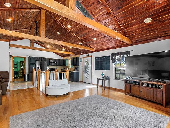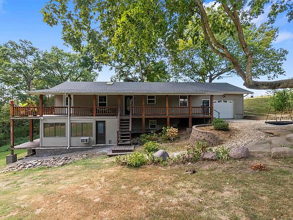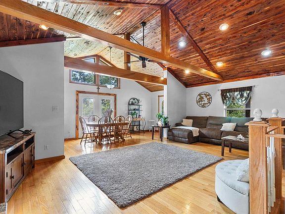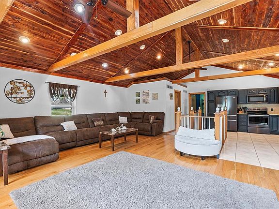 Updated ranch home has so much to offer. New roof 2023. Open concept with cathedral wood cedar ceilings. Ceramic & hardwood throughout. Kitchen updated with granite countertops & black stainless steel appliances. Main level bathroom updated in 2022, has ceramic walk-in shower, walnut walls, cedar ceiling & ceramic flooring. Main level bedroom en suite with an adjoining Jacuzzi tub. Lower level partially finished walk out basement has knotty-pine ceilings & ceramic floors. Bedroom with a half bath & rough-in for a shower, includes washer/dryer hook up. Large family room with endless possibilities. Walk into an enclosed porch that leads to a sunroom. Wrap around, partially covered deck. One car attached drive-through garage. And you will love the 40x56 insulated outbuilding built 2023- 2 garage doors, concrete floors for all your toys. Home offers an outside wood-burning stove to keep your utilities at a minimum or you can use the electric furnace. Put this on your "gotta see it" list!