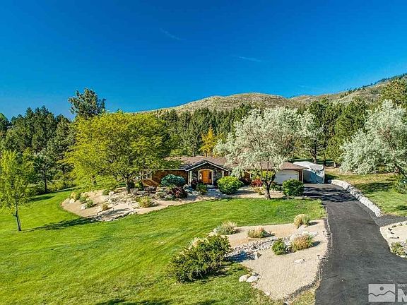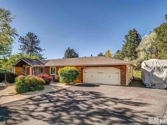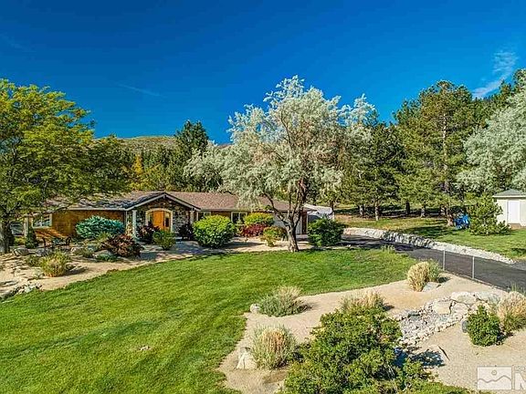 Welcome home! Beautiful custom, single-level home in Lakeview Estates is set on a 2.04 acre parcel, surrounded by towering pine trees and an assortment of fruit trees and flowering shrubs. The impressive front entry features a covered porch accented by stonework and cedar wood siding. The comfortable floorplan features a modern kitchen with oversized island, pantry, breakfast bar and quality appliances including Thermador dual ovens, a natural gas cooktop and a commercial GE Monogram refrigerator., The living room features a great room concept and is architecturally appealing with cathedral ceilings and exposed beams with lots of windows to let in natural light. The fireplace is the centerpiece of the living room, providing warmth and ambience on cool winter nights. Hardwood floors throughout most of the home add richness and beauty with easy maintenance. A wet bar (perfect as a coffee/tea station) includes a small refrigerator for drink storage plus a separate built-in ice machine. The sunny backyard is South-facing and offers raised garden beds to grow your own variety of vegetables and herbs. Three patios offer space to relax and enjoy your morning coffee or a BBQ with friends. The two car garage provides storage for recreational equipment and includes an EV charging station for electric vehicles. Great location with easy access to hiking trails and a short drive to recreation at Lake Tahoe and entertainment in Reno or shopping/dining in Carson City. Note: Springtime exterior photos provided in listing were from 2021 when the home was purchased by the current owners. Call today for a personal tour!