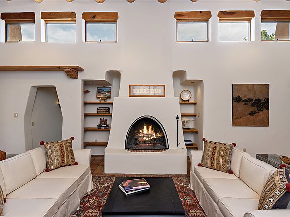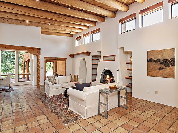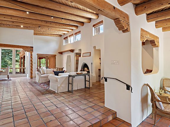 Embraced by lush, coyote-fenced grounds, this exquisite classic pueblo residence with casita and FOUR-CAR garaging, is an exceptional sanctuary. Abundant architectural details include vigas, beams, lintels and corbels with bullet carving & hand-painted accents, and rows of clerestory windows. The superb open concept design features a dramatic living room with soaring ceiling, track lighting, a fireplace flanked by deep, lighted alcoves with shelving, and French doors to the fabulous entertaining portal, pool area and mature trees & plantings. A generous dining area accesses the custom-designed chef's kitchen with breakfast & sitting/TV areas. An impressive private owner's suite bedroom boasts a high beamed ceiling, track lighting and kiva fireplace. The beautifully redesigned owner's bath and a private study have diamond plaster and in-floor radiant heat. A separate two-bedroom guest wing features a spacious high-walled courtyard with a gate to the pool & rear grounds. The delightful guest casita includes a high-ceilinged living room with fireplace, dining/office area, a bedroom and full bath. The 5 Daikon ductless mini-splits and a mini-split in the casita ensure year-round comfort. Situated just up the street from the storied Sol y Sombra estate, (owned by Georgia O'Keeffe; more recently by the late Paul Allen, co-founder of Microsoft), and within the Wood Gormley school district.