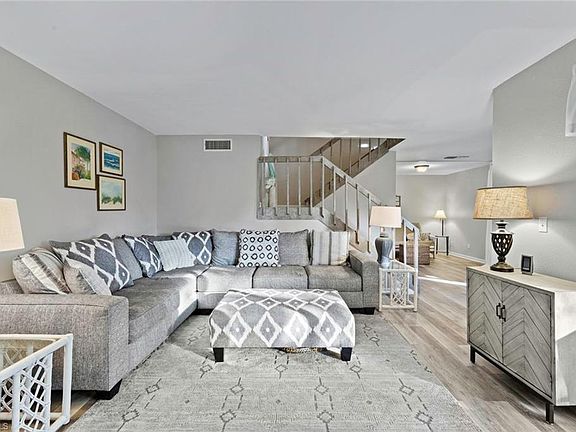 Beautiful remodeled 3 bedroom, 2.5 bathroom MOVE-IN Ready home with low HOA fees. This home has an open concept floor plan with newer flooring throughout and built-in shelves in the living room. The kitchen offers stainless steel appliances, modern tile, and new cabinet hardware. Two of the three bedrooms are equipped with a private balcony overlooking the private patio. Each of the bathrooms have been renovated. The private fenced in patio is a perfect space for relaxing and entertaining. The home comes with two assigned parking space just a few feet from the patio. Parkwoods is located in the heart of south Fort Myers close to Summerlin that is a direct link to the beaches and great shopping. Come see this house today.