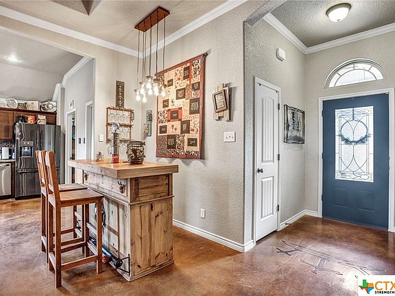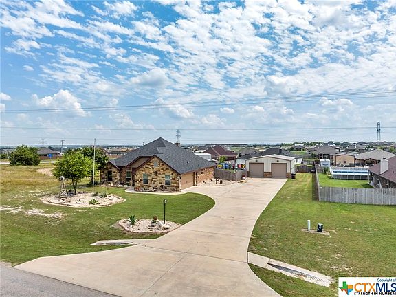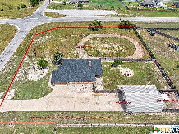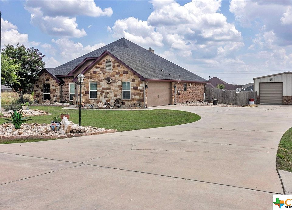 Check out this beautiful stone and brick 4-bedroom home with open-concept living and center island kitchen. Stained concrete floors. Home sits back from the road on huge corner lot. Secluded primary bedroom offers beautifully updated en suite, with granite counter, vessel sinks & walk-in shower. Enjoy the back yard's fire pit area and extended concrete patio. An approx. 30'x30' guest barndominium has its own fenced yard, 2-car garage, covered deck with full kitchen, closet, bathroom. Use as multi-gen living or income property. Square footage is in addition to the listed 2,191'. Home is minutes from Stillhouse Hollow Lake's dam, parks, marina, hiking trails. It is a short drive to downtown historic Salado and the Bell County Expo Center. Perfect access via FM 1670 to Bell County's major employment centers: Fort Cavazos, Baylor Scott & White, University of Mary Hardin-Baylor. The Austin-Metro is an easy drive south on I-35. Both refrigerators and stacked washer/dryer in barndo convey.