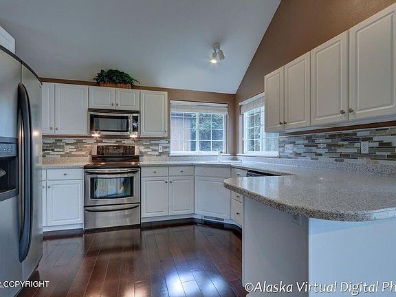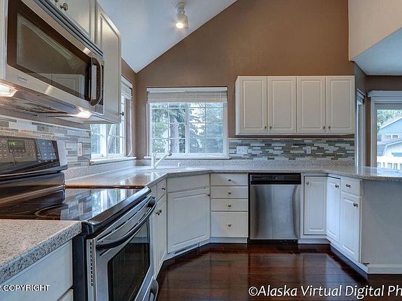Traditional living all 4 bedroom & 2 full bathrooms on upper level with the kitchen, family room, living room, dining room & 1/2 bath on the main level. Tasteful finishes with a private setting create's a warm feel to this South Anchorage turnkey home.