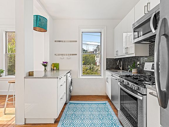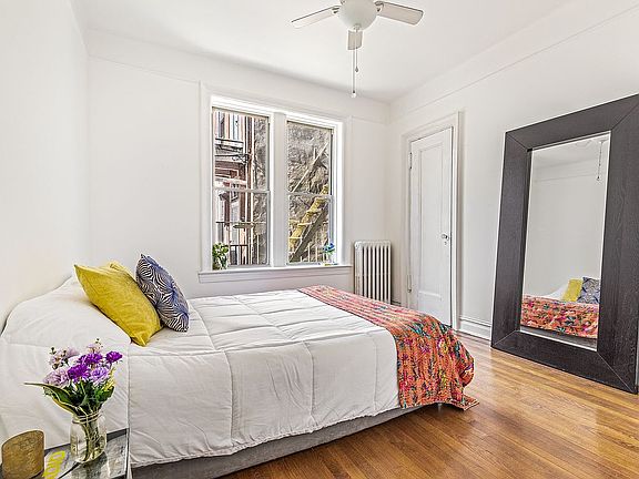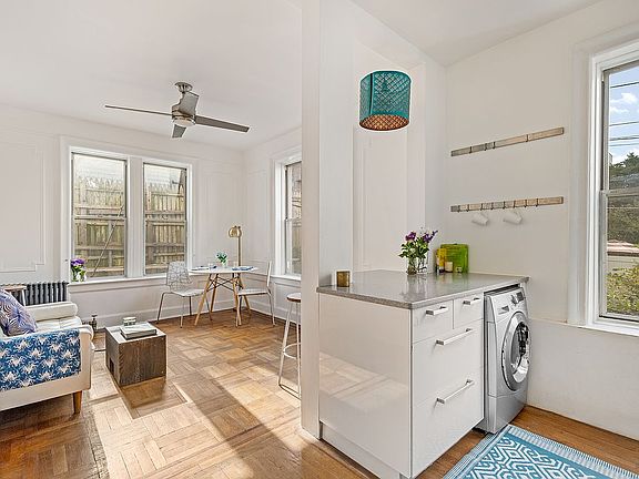 Up just a few steps from the ground level, this charming pre-war real two bedroom boasts architectural elements such as crown mouldings, decorative mouldings, high ceilings, and hardwood floors, adding character and elegance to the space. The bathroom and kitchen are modern and updated, and there's laundry IN UNIT. Beautiful light and views of greenery make the open living space a pleasure to be in.