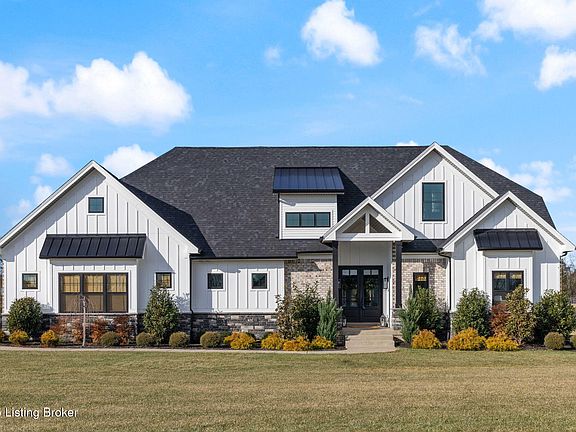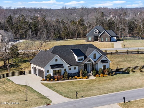 NEW PRICE -  Welcome to this Gorgeous Home located in sought after South Oldham County.  Better than new, built in 2023, featuring a modern farmhouse design and nestled on a large tree lined fenced 1.74 acre lot. There's plenty of room to grow in this 4 bedroom, 3 1/2 bath home. As you enter the impressive soaring 2 story great room with floor to ceiling gas fireplace, it serves as the homes welcoming core. Main floor features the large primary bedroom with ensuite featuring a soaking tub, separate luxurious shower and walk-in closet. The impressive Chefs kitchen is equipped with white shaker cabinets, Wolf gas cook top, stainless high end GE Cafe appliances, Quartz countertops, large island, and walk-in pantry. Convenient 1st floor laundry and mud room entry from 3 car garage. The vaulted covered deck has been expanded and overlooks the picturesque backyard. Second level features 3 bedrooms plus a bonus room (perfect for a playroom/office), ample closet space, bathroom and catwalk leading to 3rd bedroom with ensuite bath. The basement offers a spacious walkout covered patio, large John Deere room, storm shelter, lots of storage space, roughed in and waiting for your finishes! Efficient Dual HVAC. Experience the natural light bathed throughout the entire home! Don't Miss This One!!