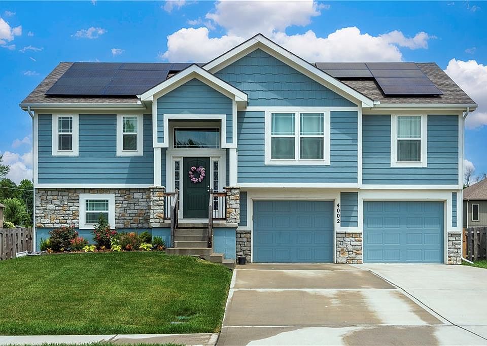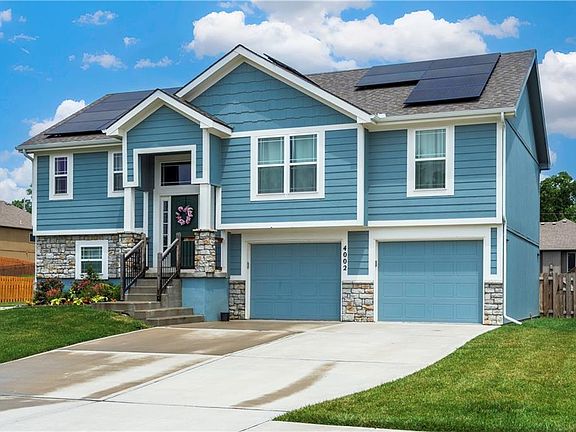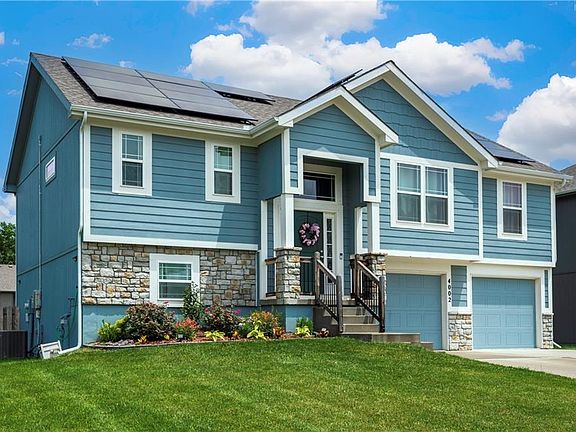 Lower level features third full bath and large family room. Nineteen owned solar panels, highest summer Evergy bill in 2024 was $12.11. This light, bright home will not last long.