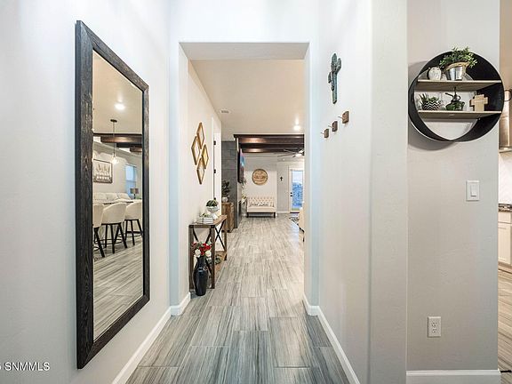 Sitting high on a corner lot in Sonoma Ranch, this 3 bedroom, 2 bathroom home captures a true modern farmhouse feel with thoughtful upgrades throughout. The heart of the home is the gourmet kitchen, featuring a 5-burner cooktop with hood vent, built in convection oven and microwave, white cabinetry, granite countertops, farmhouse sink, and a striking herringbone subway tile backsplash. The island adds character with decorative corbels and warm farmhouse details. The living room is equally inviting, highlighted by a modern tile wrapped fireplace and wood ceiling beams that add depth and charm. Tile floors run seamlessly throughout the home, ensuring both beauty and easy care. Outside, enjoy tiled front and back porches, a pergola covered patio, turf, firepit area, and views of the Organ Mountains, the perfect spaces to relax or entertain. Meticulously maintained and complete with a 2 car garage, this home blends everyday comfort with timeless design in one of Las Cruces' most desirable neighborhoods.