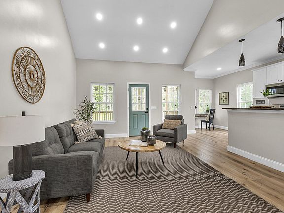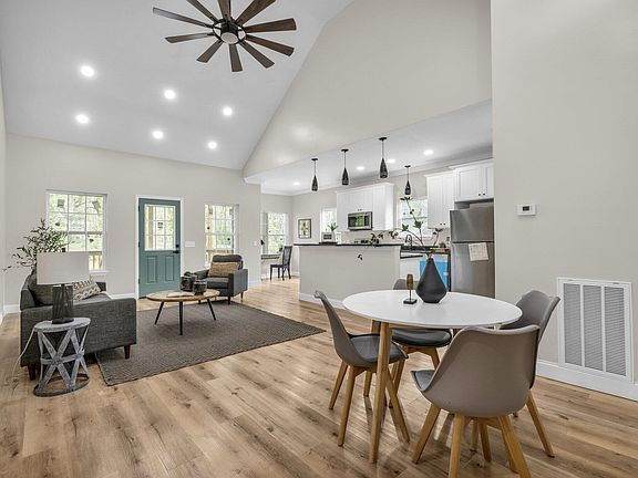 The sunlit living room, boasting soaring 22-foot ceilings, effortlessly merges with the expansive kitchen, creating an inviting space ideal for entertaining. Tailor the layout to suit your preferences, whether it be a formal dining area, cozy breakfast nook, or functional home office. The kitchen is adorned with brand new stainless steel appliances, an island offering both prep space and seating, and provides a picturesque view of the covered back porch and yard.