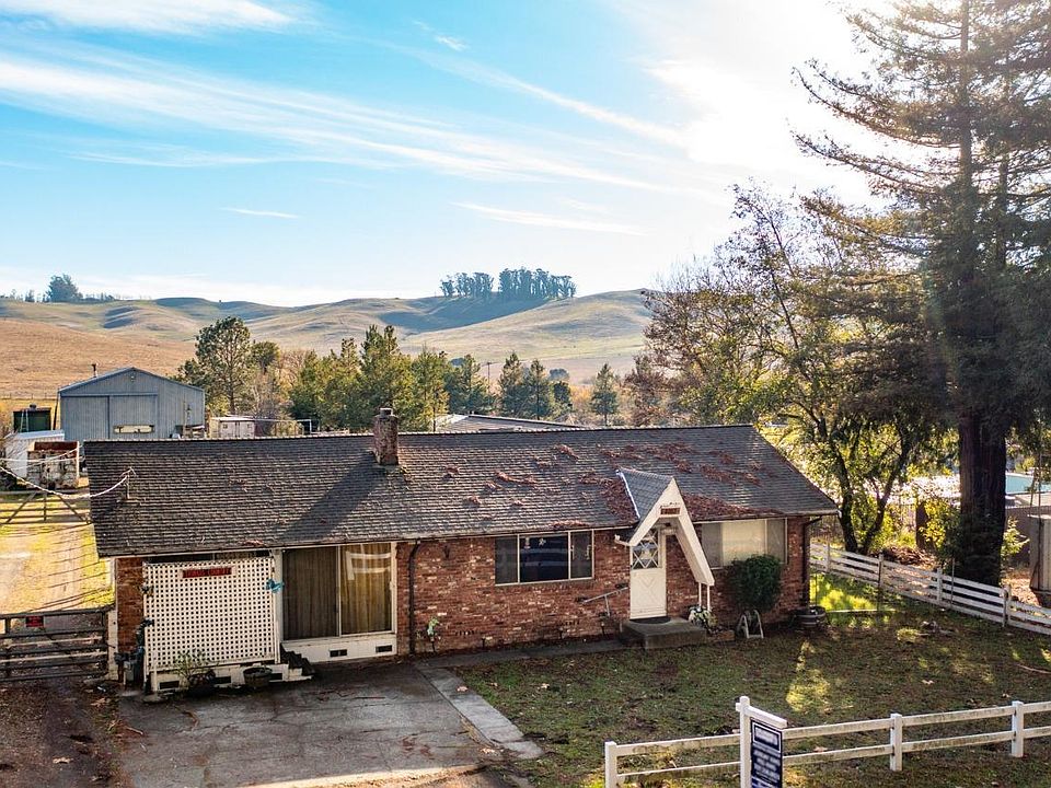Petaluma's outskirts hold this incredible opportunity on 1+/- acre with hill views. The home opens into the family room with cozy brick fireplace, oversized window, skylight, and ceiling fan. It's a wonderful place to gather with a bar window that looks into the kitchen, bright with its own skylight. A formal dining room (of office?) allows any dinner host to not skimp on the guest list, while the living room on the far end of the home can be the setting for after-dinner coffee with two glass sliding doors. The living quarters include a full bath, guest rooms, and the primary suite with private backyard access. The true countryside bliss awaits here with a covered patio and fenced yard. Continue down the drive to find some outbuildings and the grand workshop barn, complete with two levels, shelving, and lights throughout. It's ideal for both the weekend tinkerer and professional craftsman. At the end of the day, sit back and relax with a sunset over the Petaluma hills. Here's your chance to make a Petaluma acre yours with this charming property!
