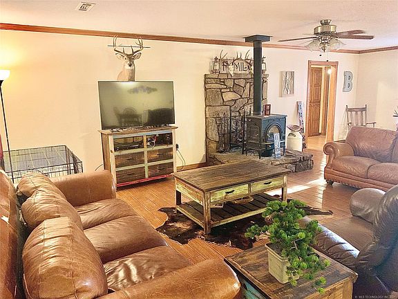 Stunning 4 bedroom 2.5 bath, 5 acre ranchette located in Stigler, Oklahoma! This home is 3195 livable sq/ft with a 1 car attached side entry garage & 30X24 insulated shop with a lean-to on back side. All bedrooms are large in size & handicap accessible with a great master suite including a large bathroom & master closet. The home has a wood burning stove, an open floor plan & lots of storage with a covered porch wrapping around the back of the home. Country living with town at your fingertips! Must SEE!