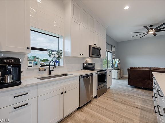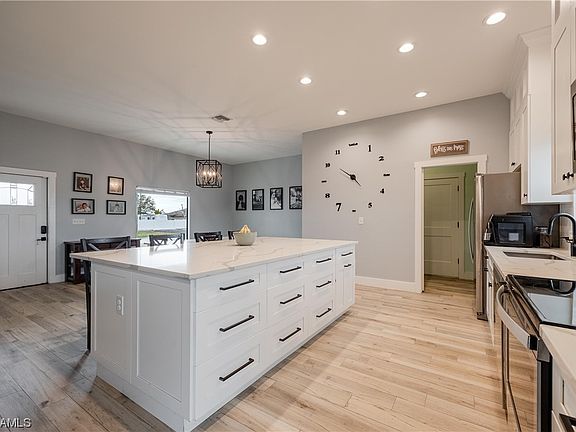 HOME WARRANTY INCLUDED AT CLOSING! 4-BEDROOM HOME NOW AVAILABLE! Check out this rare, mediterranean style beauty which was built in 2019 and is a 4-bedroom, 2-bath, and has 2,040 Sq. Ft. Living space 2,486 Sq. Ft. total. Make this stunning spacious Saint Mia floor plan by DeLaCruz Homes yours today. You'll instantly notice the gorgeous Calacatta quartz countertops, stainless steel appliances, huge kitchen island, upgraded wood looking tile throughout the home, luxurious bathrooms with glass enclosure showers, handmade cement tile, upgraded doors and trim, high-end fixtures and sinks, double closets in bedrooms rooms, trellises with gorgeous wood style garage door. On the exterior enjoy tropical landscape with a magnolia tree, palm trees, and two 8ft oak trees planted in the back yard. Upgrades galore! Located in Flood Zone X, so no flood insurance is required! Lehigh Acres is located in eastern Lee County. It is bordered to the north by Alva, to the northwest by Buckingham, and to the southwest by Gateway. It is bordered on the west by the city of Fort Myers and extends east to the Hendry County line. Lehigh Acres is known for some of its popular attractions, which include: Harn's Marsh · Five Star Stables · Majestic Golf Club · Copperhead Golf Club and Trailhead Park. Lehigh Acres boasts ponds, lakes and canals. With 175 miles of canals and 16 well-stocked lakes, Lehigh Acres is a perfect destination for both fishing enthusiasts and beginners alike. For a change of pace, the Gulf of Mexico and its nearby barrier islands provide spectacular saltwater fishing opportunities, with bountiful grouper, mackerel, redfish, snapper, snook and trout. For a challenge on the green, visit one of Lehigh Acres' four championship golf courses. With parks, lakes, tennis, and safe roads for bicycling or walking, this charming suburban enclave is the ideal retreat for families or seniors seeking an affordable and laid-back vacation.