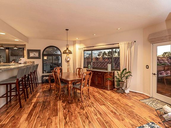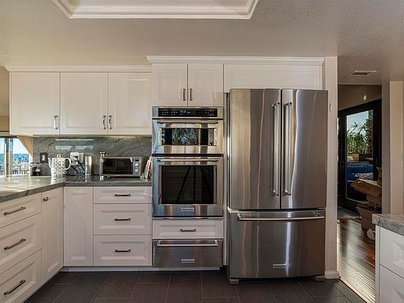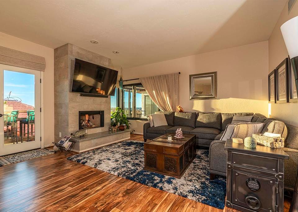 This upgraded Spanish Villa in historic Old Town District San Diego offers breathtaking views of the ocean, bay, Sea World, downtown, Mt. Soledad, and Old Town. Enjoy stunning sunsets from two private balconies, and experience the convenience of a highly walkable neighborhood with popular restaurants and shopping just a short walk away. Completely detached from other villas, this turn-key property is situated in a small, gated community and features Anderson dual pane windows throughout with a lifelong warranty, new A/C system, and beautiful engineered-wood flooring. The chef’s kitchen has been completely remodeled with custom cabinets, modern Kitchen Aid appliances, and abundant quartzite natural stone countertops, making it the perfect space for cooking and baking. The open floor plan includes a great room and dining area with exceptional city views, a cozy tile & quartzite wrapped fireplace, and a private back patio for entertaining or quiet relaxation. The upstairs master suite boasts a private terrace with stunning views, a walk-in closet, newly upgraded dual master bath areas, and a large soaking tub. The guest room includes a newly remodeled private en suite bathroom. This private Spanish Villa community has 7 different levels, and this villa is located mid-way up the bluff side with tremendous privacy and views that don't stop. The community features a good-sized pool and spa, and easy freeway access to the I-5 and I-8. Additionally, the community has a private funicular/hill-a-vator that runs up and down the hillside to take you to the upper levels. Don't miss out on this rare opportunity to own a truly unique property located only minutes from the airport, downtown, Point Loma, Petco Park, Little Italy, and more. With two assigned parking spaces and additional storage under the stairwell, this Spanish Villa is the perfect place to call home.
