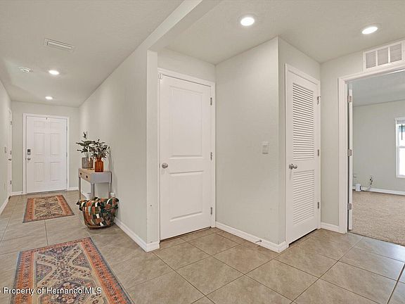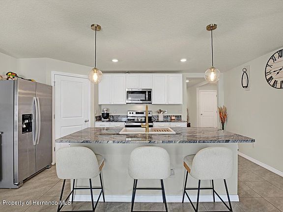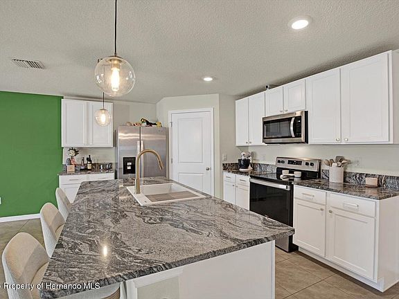 Welcome to this beautifully designed D.R. Horton Cali home, where modern comfort meets stylish living. The primary bathroom features dual sinks, a spacious walk-in closet, and sleek white cabinetry. The kitchen shines with a walk-in pantry, solid wood cabinets, stainless steel appliances, upgraded fixtures, a coffee bar, and a granite island with an integrated sink, dishwasher, and extra storage. Tile flooring flows throughout the main living areas and all wet spaces, offering both style and practicality. The second bathroom includes a convenient bath and shower combo. Step outside to the lanai, perfect for grilling and entertaining while enjoying the privacy of the fenced backyard. This home truly has it all! Sterling Hill, a gated community, offers an exceptional lifestyle with resort-inspired amenities, such as two pools, splash pads, playgrounds, a dog park, tennis and basketball courts, picnic areas, a fitness center, and even a pool table. Residents can also opt for additional boat and RV storage for added convenience. Perfectly situated near a variety of dining, shopping, and outdoor activities, this home embodies the best of Florida living. Explore the crystal-clear, 72-degree waters of Weeki Wachee Springs by kayak or paddleboard alongside gentle manatees, or enjoy breathtaking sunsets at Pine Island Beach, just a short 20-minute drive away. With quick access to the Veterans Expressway, you're only 40 minutes from Tampa's renowned attractions, including theme parks, museums, and vibrant nightlife. Don't wait—schedule your showing today and make your Florida dream a reality!