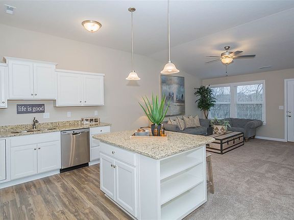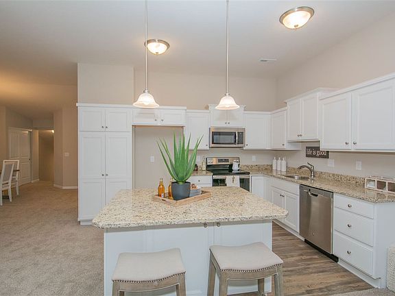Penthouse style living in this Wexner plan by Fischer Homes in Paragon Mill. Island kitchen with stainless steel appliances, upgraded maple cabinetry and granite counter tops all open to the large living room with vaulted ceiling and walk-out to covered deck. Dining room could be used as a study. Owners suite with large walk-in closet and walk-in shower.