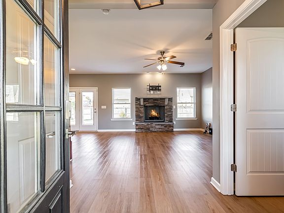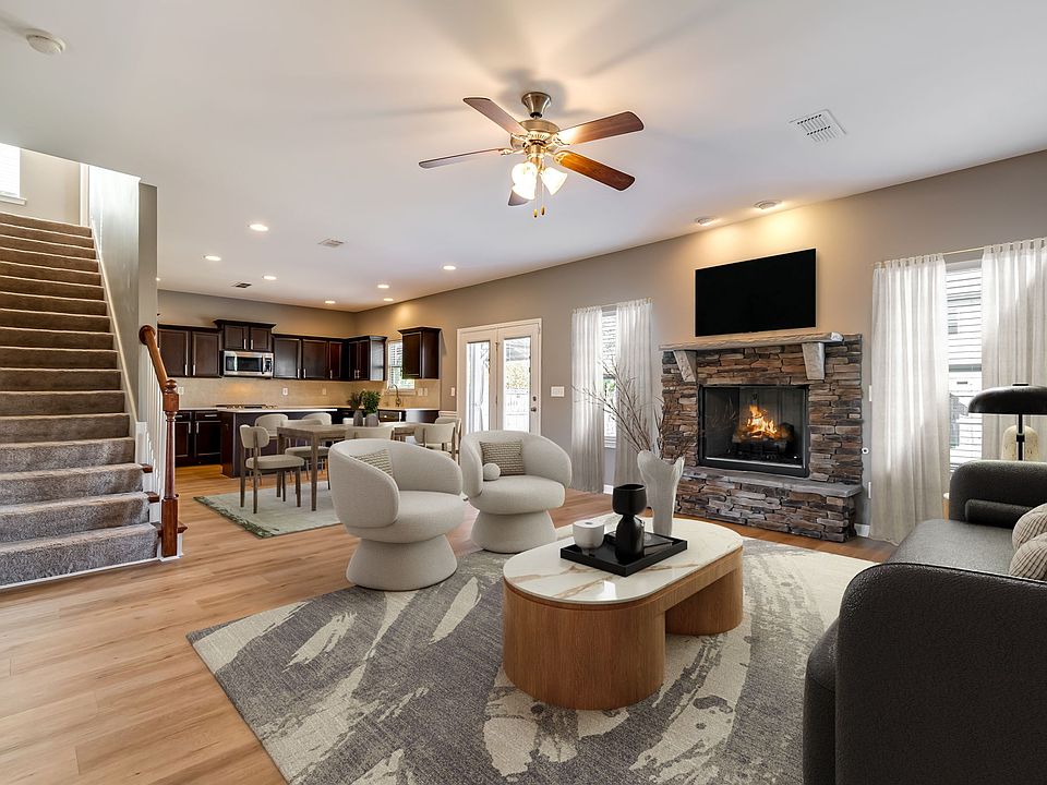 The spacious, updated kitchen showcases quartz countertops, a coordinating tile backsplash, recessed lighting, and abundant cabinetry—including a large island with seating for two. Enjoy all-new stainless steel Samsung appliances, a deep sink, and a convenient pantry. The open dining area, accented with elegant picture-frame molding, flows seamlessly into the living room, where a stunning stone fireplace serves as the centerpiece.