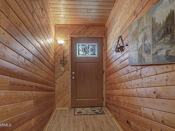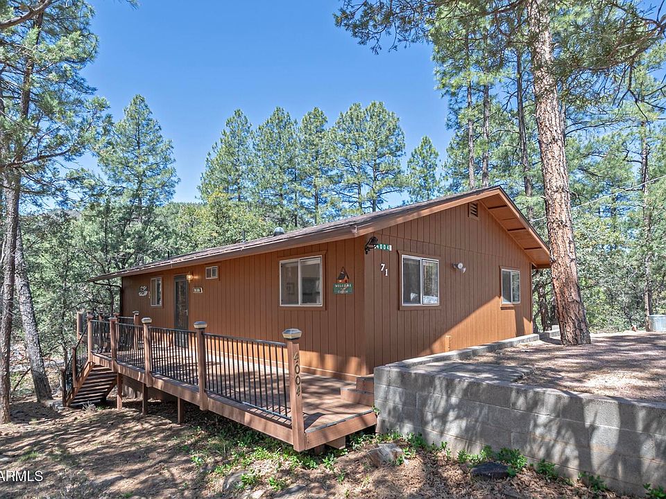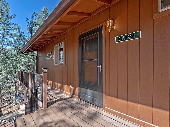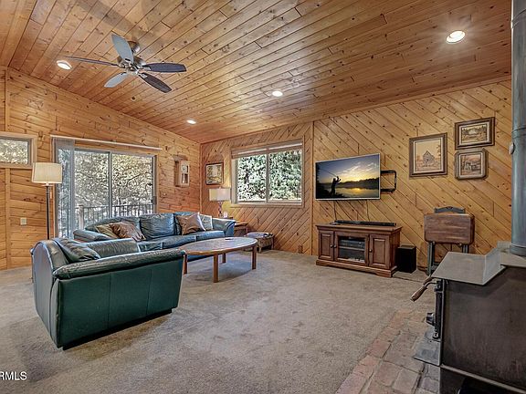 True Cabin in the Woods - Private Retreat at the End of the Road Welcome to this charming 2-bedroom, 2-bathroom true cabin in the woods, tucked away at the end of a quiet street for ultimate privacy. Surrounded by nature, this home offers a peaceful escape with a warm, rustic interior featuring wood accents throughout and soaring wood cathedral ceilings that enhance the cabin ambiance. Enjoy a spacious open floor plan that seamlessly connects the living, dining, and kitchen areas—perfect for entertaining or relaxing. The updated kitchen and bathrooms combine modern convenience with mountain charm. Stay cozy with a wood-burning stove in the main living area, and enjoy year-round comfort with forced air heating and air conditioning. Step outside to expansive composite decks.