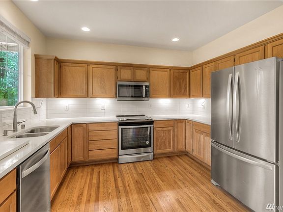 Beautifully updated. New exterior paint! Two Story/Town home style shares 1 common wall. New flooring, paint, cabinets, counters, appliances. Walk to neighborhood parks, schools, shopping, dining. Corner lot w/ 2 car garage. Interior features include gas fireplace, quartz counters, over sized master suite with 5 piece bath, bamboo floors, main floor half bath and laundry. Conveniently located w/easy access to major thoroughfares, employment, transit. NO MONTHLY DUES!!!! Annual Dues $400.