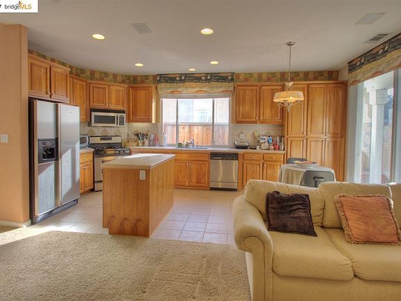 Very nice former model home with 4 bedrooms & 3 full bathrooms, 1 of each downstairs. There's also a loft upstairs with a built-in desk & hardwood floors. (Could be 5th bed) Great location with no rear neighbors & views of Mt Diablo & foothills. Near golf course & county park. Nice open floor plan with formal living & dining rooms, open kitchen & family room. Many upgrades including stainless appliances, window coverings, ceiling fan/light fixtures, marble entry flooring & fireplace surround, speakers throughout most of the home, mirrored doors, alarm system & more. Yard features covered patio, fruit trees, even an arbor to hang a hammock. Wide side yard with shed.
