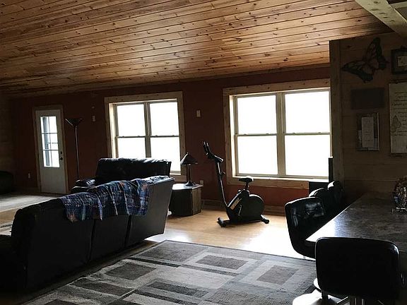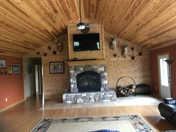 Reduced to Sell!-home located on over 6 acres a partial wooded area. Garage has water and sewer/possible living space also maybe used for shop or horse shelter. Home has large kitchen commercial grade stove, pantries, ceramic floors. Hardwood and tile floors. Walk in closets in bedrooms, large master bath, lighted tray ceiling in large master bedroom. Large open basement with egress windows and two additional partially finished rooms. Perfect for additional living space. Fireplace is connected to heating vents for wood heat if desired. Custom well pump system and storm shelter in basement.