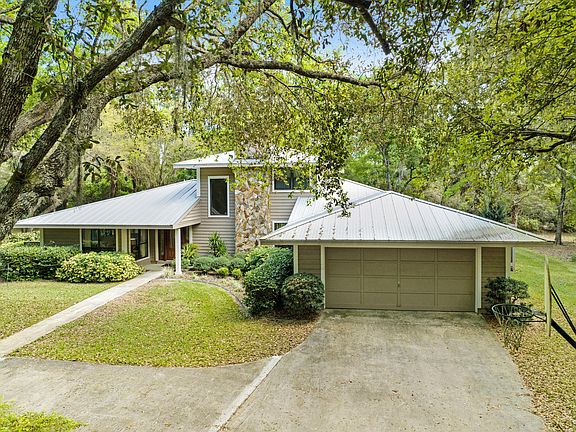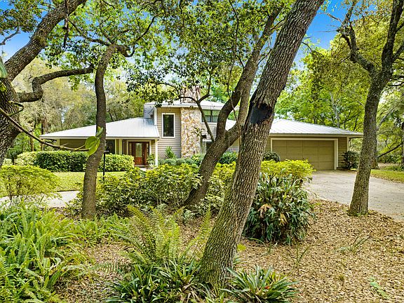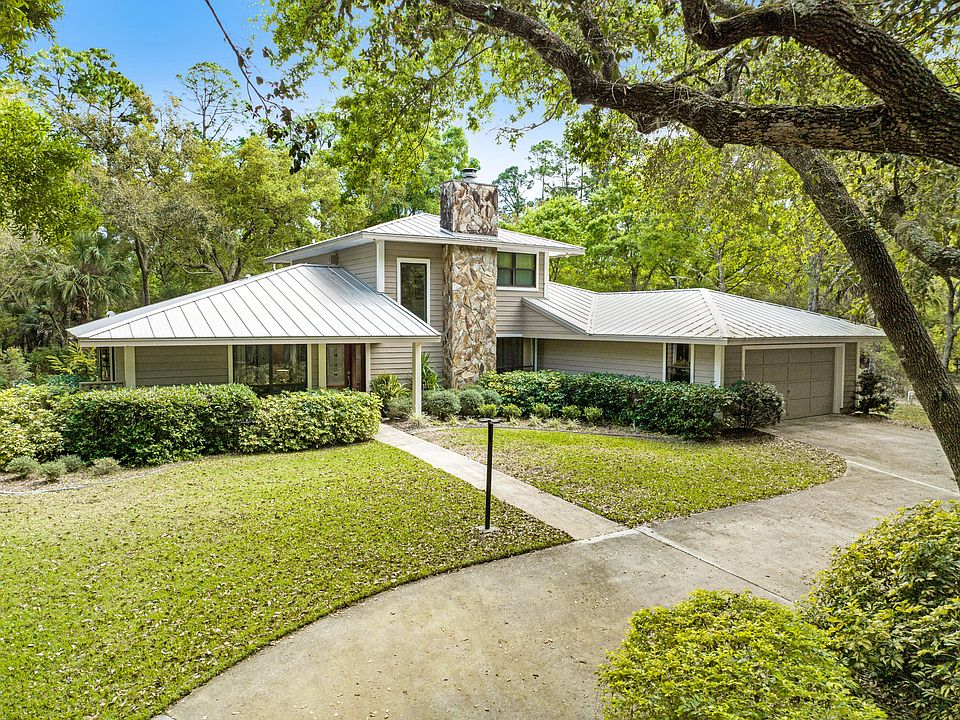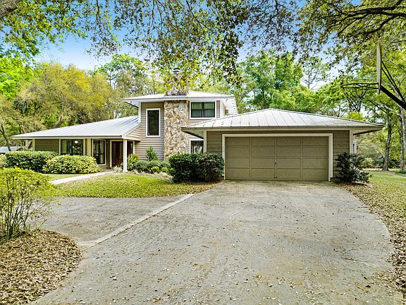 Wow! Discover 3.55 acres of beautifully landscaped property, featuring large oak trees thru-out the park-like setting. Enjoy the convenience of a fenced-in area spanning 2 of the 3.55 acres, complete w/ a horse barn that has its own street entrance. The backyard is truly magical, offering landscaped sitting areas, benches, & a brick BBQ area. A circular driveway ensures plenty of parking space. The home's exterior boasts a stunning two-story-high stone fireplace. Inside, you'll find a large formal living room w/ a stone fireplace, a spacious family room, formal dining, and an eat-in kitchen area surrounded by ample windows. The oversized master bedroom, located on the first floor, includes a remodeled bathroom. The second & third bedrooms are situated on the second floor, adjacent to a fully remodeled bathroom. Additionally, there's a convenient half-bath on the first floor. Hurricane windows have been installed on the second floor and in the master bedroom for added safety. The dining area opens to a screened-in patio, and there's a charming brick patio off the kitchen, perfect for morning coffees. The kitchen itself is light and airy. This well-maintained home, cherished by its original owner, comes with a full termite bond. The roof, made of durable metal, was replaced in 2007. The residence features a dual AC system, with one under a 10-year warranty and the other slightly older. A deep well provides irrigation and a separate shallow well supplies the house, complemented by a water softener system located in the garage area. One of the two septic drain fields has been recently replaced. Furniture is also available for sale.