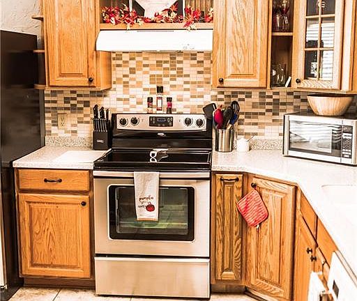 Beautiful home with tile entry and laminate wood flooring in living room, hallway and bedrooms. Tiled bathrooms and kitchen. Kitchen has corian counters with seamless sink and is open to large living area with breakfast bar. Large sliding glass door leads to covered patio. Vinyl siding replaced and trim painted in 2016.
