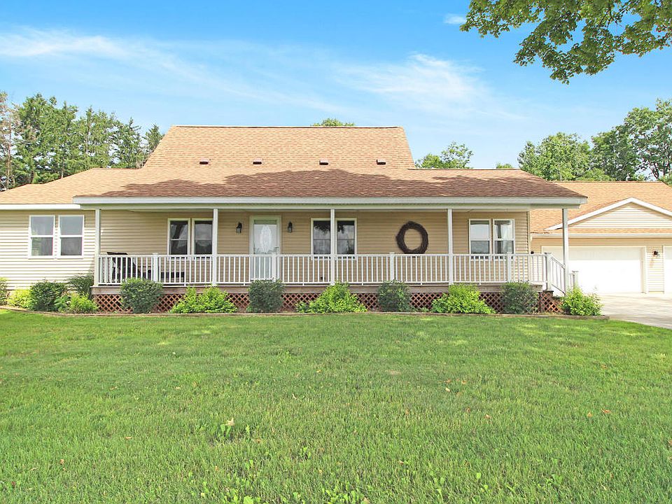 -7.9 acres Simply irresistible. More than just a place to live, this thoughtfully remodeled farm style home is a place to really enjoy life. Kitchen updated with enjoying family while cooking; master bedroom (28x23) open design; additional bedroom with 2 closets.Living room with uplights and molding. Large laundry room on main floor, pantry, heated breezeway. Upper level features two bedrooms (one walk thru). Garage envy alert - 3 heated stall PLUS dog bath area, Additional stall & storage stall.