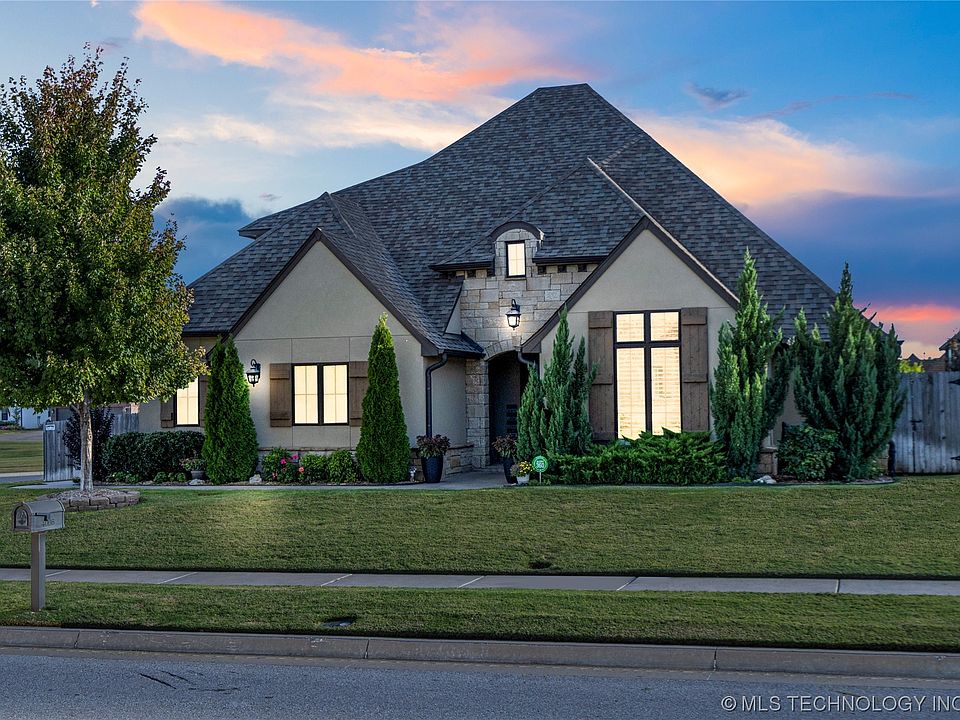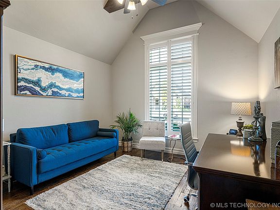 Beautiful home situated on a corner lot, side entry garage and views of pond. Wonderful floorplan, primary plus 2 bedrooms and office on first level. 1 bedroom, full bath and game room up. Spacious rooms throughout, hardwoods, stone fireplace & wonderful windows. Fresh and functional kitchen, large island, 6 burner gas cooktop, pantry and dining area. Perfectly located primary suite with lovely bath. Seasonal closet opened to laundry. Incredible outdoor living area with fire pit extended patio with pergola. Neighborhood Pool & Cabana, Ponds for catch and release fishing. Great location just off Creek Turnpike. Bixby Schools.