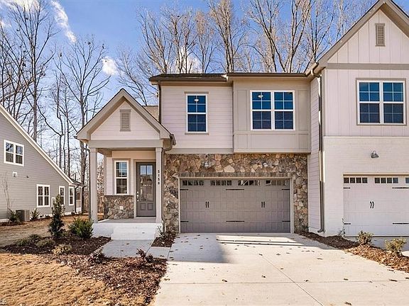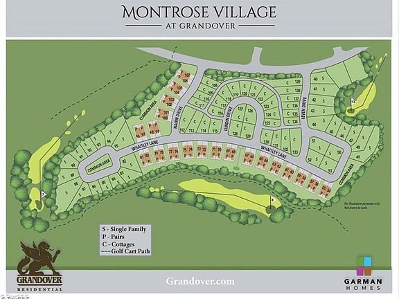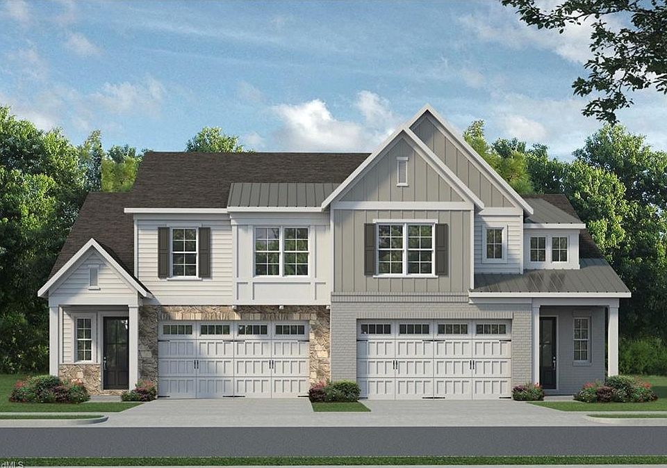 The Five Peaks plan, Elevation A (left side) Destination Villas by Garman Homes in Montrose Village at Grandover. Features 9' smooth ceilings, soft-close doors on all cabinets, and a kitchen with Solid surface countertops, and stainless steel appliances. A professional designer has curated all color selections (some are subject to change). Two cars attached garage, Montrose Village HOA includes lawn maintenance, Grandover HOA includes Community pool and racket club on Pemberton with Fitness center, playground, clubhouse, and tennis courts. The tax value is undetermined since the property is new construction.