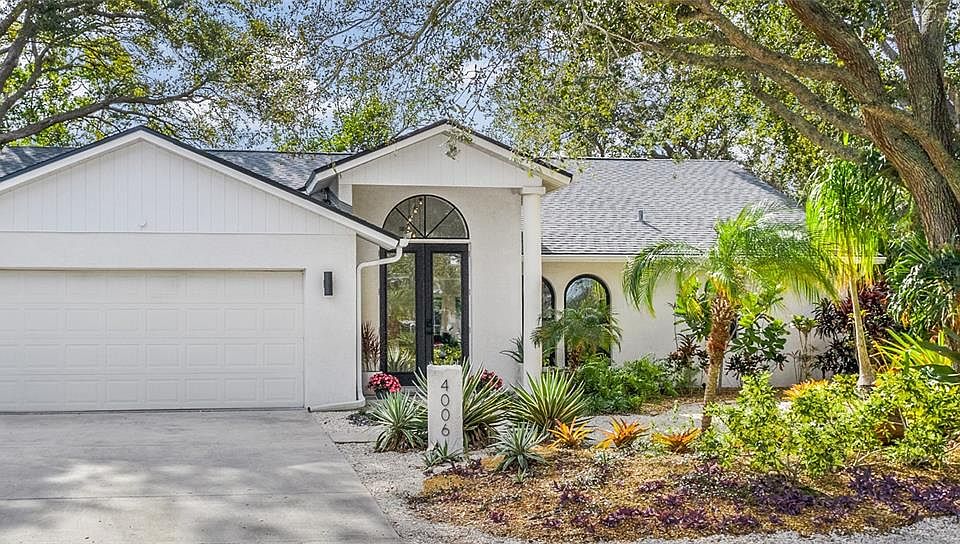 LOCATION, LOCATION, LOCATION & fully renovated with NO HOA. You will want to tour this open concept floor plan modern yet classic “New Colonial”. From the moment you step though the new 8 foot double entry doors you see generous spaces, vaulted ceilings, and a LED lit wave feature wall. The bright great room with new arched hurricane windows on through to the south facing private palm filled lush backyard. The continuous wall of patio doors let plenty of Florida Sunshine and greenery delight. The gourmet kitchen boasts: an oversized island with waterfall counter end, double sided cabinets below for quick access to breakfast, drinks and snacks, accommodates 4 large stools, high gloss European cabinetry, and new appliances. Outdoors the expansive screened entertaining area has a hot tub. You'll relax more with this low maintenance front and side yards and easy care fenced private backyard with a jasmine covered gate. Space abounds again inside since this home has a king size primary bedroom, walk-in closet, double vanity, and direct access to the glass office where daylight abounds though oversized windows and doors creates a private retreat. The split floor plan has two more bedrooms, bathroom, ample size laundry room with utility sink, 3 storage closets. The 8 foot tall attic with thermostat cooled fan provides plenty of additional storage via drop-down stair in the two car garage. Estimate for remaining hurricane rated replacement windows/doors available. NEW permitted 2023 roof, NEW 2023 water heater, NEW water softener, NEW appliances, NEW flooring/baseboard/paint inside and out.... Plus this oversize 11,000+sqft lot with ample RV, boat, or trailer parking with a 50 amp outlet, room for a future pool. Flood zone 'X'. Remaining hurricane rated replacement windows/doors can be included as an option. This location is best when Sarasota has so much to offer whether a short drive to Siesta Key beaches, Downtown night life, UTC, or a short walk to Trader Joe's all just minutes away.