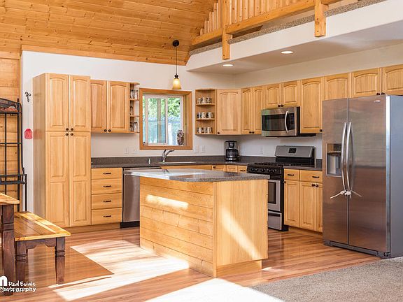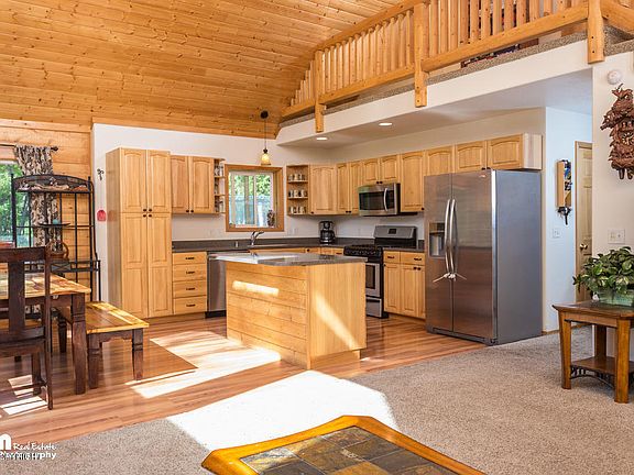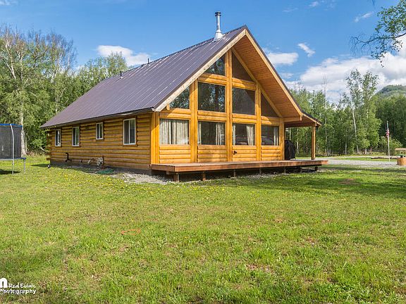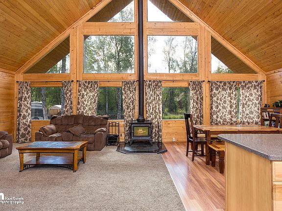 Amazing Alaskan Log home with wall of windows showcasing fabulous views of Pioneer Peak and on acreage! Huge vaulted ceilings! Newly installed wood fireplace, open floor plan, hickory cabinets, hard surface countertops. Master suite with private bath and walk-in closet. Beautiful wrap around deck. Comes with a barn, perfect for starting you own chicken coupe! You will want to see this one!