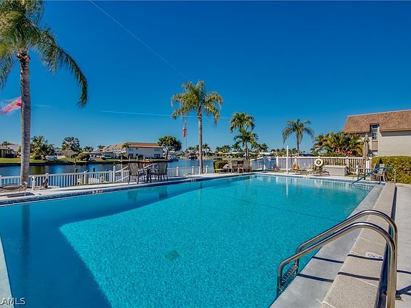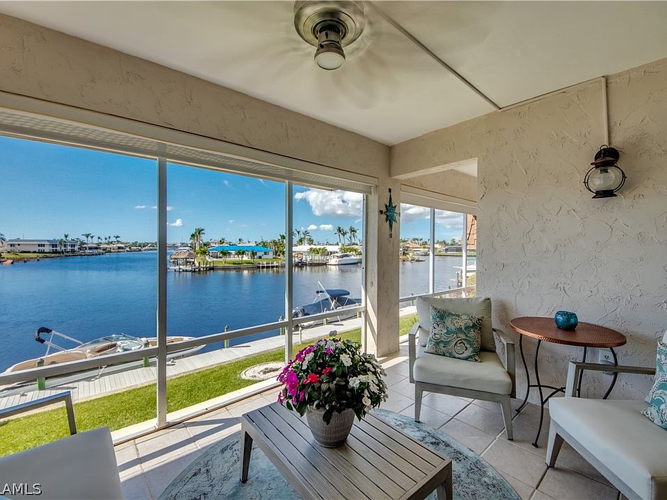 VACATION MODE! Every time you step in the doors of your new condo, it will feel like vacation! Unending water views of this 200’ wide INTERSECTING, SAILBOAT access canal! Like living on a cruise ship! Beautifully decorated, updated and furnished for you! Nothing to do but enjoy SW Florida living! Watch the dolphins play, the fish jump, the boats drive by & savor the sunsets! Clean & bright white kitchen with new stainless steel appliances, granite counters & walk in pantry. Moveable island for food prep or dining. Beautifully updated bathrooms. So MANY EXTRAS: Full length lanai with roll down shutters, 2 impact glass windows, 2 storage closets, crown molding, six panel doors, soundproof luxury vinyl flooring throughout, HWH 2023, AC 2015 & ASSIGNED carport. New roof 2021. Dock space first come/first serve with available space. Offered TURNKEY with a few exclusions. Enjoy boat traffic, kayakers & dolphins from your private lanai. Gather at the community room or heated pool for cocktails. Use the condo tool/workshop. No pets & 55+ condo. Around the corner from the beautiful Caloosahatchee River & Jaycee Park for walks, fishing, cars shows, movie in the park & more. This is the one!