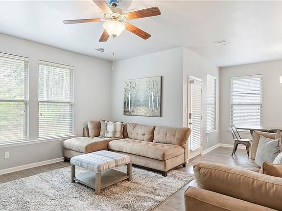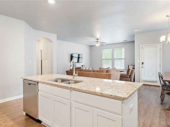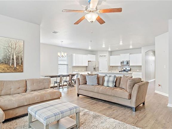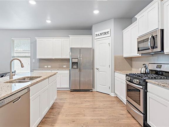 Only 3 years old and ready to move in. This open, split floor plan house that backs up to green space has white cabinets, white granite, subway tiles for the backsplash, stainless appliances , gas stove, walk in pantry and large island. 1 bedroom is off with its on hall that would also make a great office. Large primary bedroom with the windows overlooking backyard. Easy access to the main entrance and 2 blocks from the community pool, pavilion, playground and walking trails.