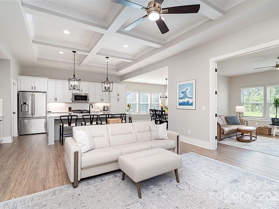 Fully custom golf course home on a private 1/2 acre home site! This stunning 3-bedroom, 2-bath single story home offers modern living in one of the Carolinas’ premier golf communities. Overlooking the 17th green and 18th fairway of the Carolinas' Top 100–ranked Stonebridge Golf Course, the home enjoys a southern-facing rear view and access to resort-style amenities including a pool and cabana, pickleball and tennis courts, and a fitness center. Inside, the thoughtfully designed floor plan is elevated with custom features throughout. The great room and kitchen showcase soaring 11’ coffered ceilings with recessed lighting, while the sunroom and extended dining area create the ideal spaces for both relaxation and entertaining. The chef’s kitchen features upgraded Lusso quartz countertops, 42” soft-close cabinetry with roll-out drawers, a stainless steel farm sink, under-cabinet lighting, and Frigidaire Professional appliances—including a gas oven. Retreat to the spacious primary suite, complete with a sitting room and a luxurious spa-like bathroom featuring large-format tile, premium cabinetry, and upgraded fixtures. Additional highlights include upgraded Pergo sustainable wood laminate flooring, wainscoting in the foyer, 8” baseboards, and whole-home custom blinds. Outdoor living is equally impressive with over 750 sq. ft. of extended patio space finished with concrete, tile, and pavers—perfect for enjoying tree-lined backyard views. Professional landscaping with expanded flower beds and a drip system enhances curb appeal, while Anderson storm doors, luxury lighting and ceiling fans, pre-wired audio, and a security system with video cameras ensure comfort and peace of mind. Practical upgrades include a garage bump-out with EV charger pre-wire, an enhanced HVAC system with high-performance filtration, and Sherwin Williams washable paint throughout the home. This is more than just a home—it’s a lifestyle, offering modern elegance, community amenities, and breathtaking views in one of the Carolinas’ most sought-after golf communities! Roughly 10 minutes to downtown Waxhaw where you can enjoy endless events, shopping and restaurants!