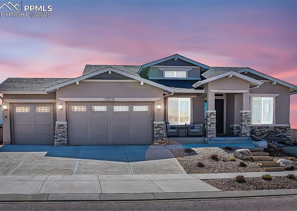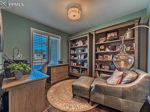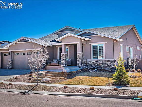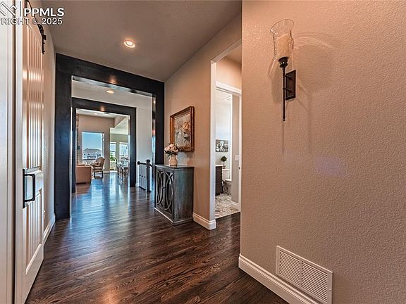 Step into this stunning home through an immersive 3-D tour and discover its exceptional blend of elegance and functionality. Designed as an open-concept ranch plan, this Cordera Saddletree Model Home, offers a main level featuring a spacious master suite, a guest bedroom, an office, and a 3-car garage, complemented by five bedrooms and four bathrooms in total. The finished basement expands your living space with a wet bar, a junior master suite, a rec room, a games area, and abundant storage. Throughout the main level, oak hardwood floors flow seamlessly from the entryway into the great room, kitchen, dining area, and office, while the gourmet kitchen impresses with KitchenAid/Whirlpool appliances, including a 6-burner gas cooktop, oven/microwave combo, and dishwasher. Sleek granite or quartz countertops and undermount sinks grace every space, paired with upgraded cabinetry and a striking 9’x5’ kitchen island crowned by a full-tile backsplash and a whole house water purification system. The home has a security and camera system in place, and a 1 year old hail rated roof. The home’s thoughtful upgrades extend to 8’ doors, 12’ ceilings in the airy great room, and 9’ basement ceilings, creating an open, spacious atmosphere. Relax by the gas fireplace with its full stone surround or entertain on the covered rear patio, outfitted with speakers and recessed lighting and a whole house programmable exterior lighting. Additional luxuries include barn doors at the office and master bath entrance, alder-wrapped entryway columns, and a laundry room with built-in cubbies, quartz-topped sink, and direct access to the master walk-in closet. Natural light floods the main level through expansive 5’+ windows, accentuating the home’s bright, move-in-ready appeal. Nestled on a fully landscaped, fenced corner lot, this property combines upgraded tilework, lighting, and designer finishes to deliver a turnkey living experience where every detail exudes sophistication and comfort.