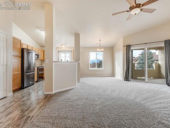 Amazing 3 bed, 2 bath condo in the gated Hillsboro at Springs Ranch Community! Located on the second floor, this spacious ranch floor plan presents a spacious open concept living area with new plush carpeting and vaulted ceilings. The kitchen features beautiful LVP flooring, a bar top counter for extra seating, newer appliances, window ledge, and plenty of storage. The naturally-lit dining room walks out to the private balcony, perfect for morning coffee or entertaining with a mountain view. The large owner’s suite is a retreat offering a walk-in closet, full bathroom with tub/shower, and double vanity. Laundry closet with included washer & dryer! Air Conditioning to keep you cool on summer days. Enjoy easy living in this beautifully maintained complex which includes a gated entry, club house, fitness center, pool & hot tub. Dues also include all exterior maintenance, landscape, trash & snow removal! Conveniently located near the Powers corridor with easy access to shopping, restaurants & entertainment, and military bases.