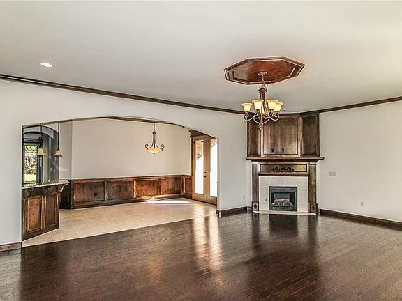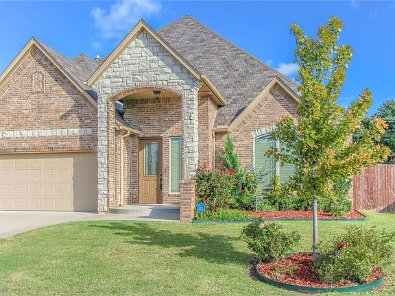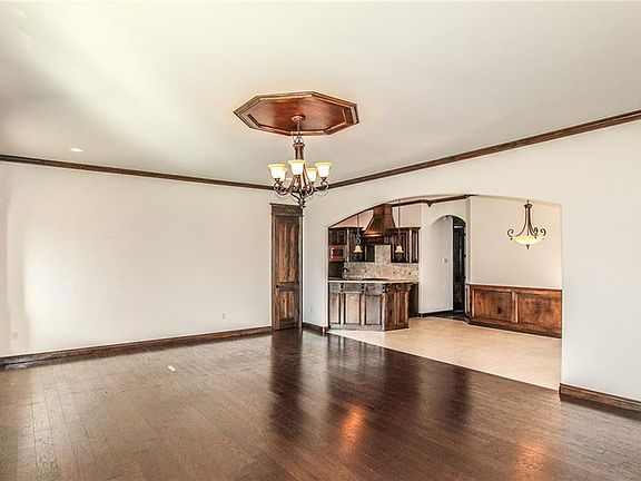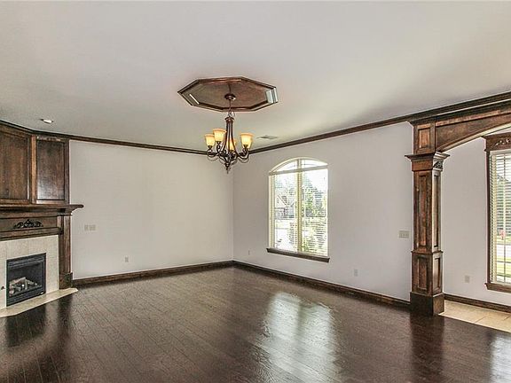 Arched wood trim entry supported by carved mahogany pillars. Wide, welcoming living room with centered chandelier and corner fireplace. Granite counters that flank boh kitchen sink and cooktop gas burners. White tile floor that extends from wainscoated lounge/tv area w/ windowed double doors looking onto east patio to breakfast area with granite topped serving table on the west. Master suite in SE corner includes huge 9x10 closet with shelves, luxury bath with jetted tub and separate shower stall. Again granite tops and chandelier/ceiling fan. Along the hallway leading west are formal dining to the right and two more baths to the left, one with pedestal wash stand and shower and the other with tub-shower. This path gives access to 3 full bedrooms on the NWside. This home also has both 2 car and one car garages, and ample yard space on all sides, yard in back has privacy fence.