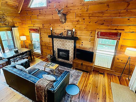 Get away from the hustle and bustle of the city and spend time looking at the mountains from this modern log home. The home sits on a hill with views to the western mountains. The home has a wonderful open floor plan on the 1st floor, with master bedrm and bath. Amenities include old pine floors, soapstone appointed fp, Vaulted ceilings, with many windows, lovely wood, huge porches to enjoy the view and the wildlife. Addition floors include a large loft for guests, lower level with family room, full bath, bedroom and laundry. Porches are spectacular summer or winter. Fire pit on the top is great for an evening of star watching. A true get away for family and friends. Very short drive to Charlottesville, Nellysford and Wintergreen.