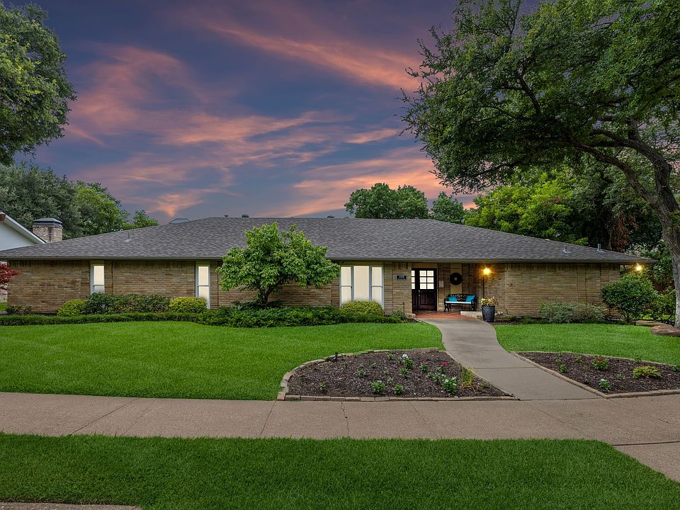 Located in the heart of the private school corridor. When you walk thru the double doors you are greeted by the vaulted ceilings in this great room with the fireplace framed by floor to ceiling picture windows which create a bright and welcome living space. The kitchen is in the heart of the home with a large butcher block island open to the secondary living. The primary bedroom has a tray ceiling and French door to a private patio. The primary bath double vanities and storage, featuring modern fixtures, soaking tub, and oversized shower. Renovation includes new roof (2020), replacement of cast iron plumbing (2024), energy efficient windows, redesign of laundry room (2020) and much more. Youl will love this ranch home sitting on an oversized corner lot amongst mature trees across from the neighborhood park and walking distance to Glen Cove Pool.. Convenient access to 635, North Texas Tollway, and I-35 as well amazing shoping and dining.