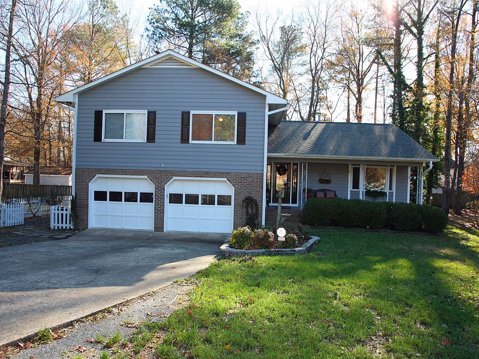 Marvelous split level in quiet neighborhood. Updated bathrooms and kitchen cabinets. Lower level bedroom has attached bath with shower great for guests or family. New French doors with internal blinds. Custom kitchen cabinets with granite and tile backsplash with attached breakfast area. Large neighborhood lot with trees for shade. Open family room with gas log fireplace and beautiful hardwood floors. Upstairs has four bedrooms with bamboo floors. Quick access to highway 70 and Interstate 85.