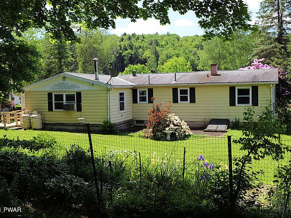 Here's your chance to own your home in the country. Easy-living on one-level ranch features 3 BR and 2 full baths. Covered entry off the side keeps you out of the elements... come in through family room. LP gas fireplace for extra coziness. Efficient kitchen with multiple cabinets and good counter space. Spacious Living room and dining area. Fenced back yard with lovely gardens. 8 acres of groomed trails to hike or quad throughout; mix of cleared land and woods. Nice post and beam barn. Terrific hillside views from covered front porch. Tucked high off the road, you'll feel real privacy, yet you're just 30 min to Honesdale for shopping or 20 minutes to Callicoon, NY and the Delaware River.