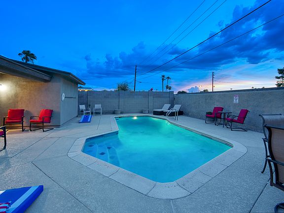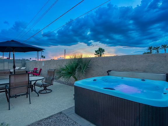 Charming 4 bed, 3.5 bath home with 1-car garage on a spacious lot featuring a heated pool, hot tub and putting green. Gorgeous desert landscaping, dual paver driveways, front patio, and courtyard-style entry enhance the curb appeal. Kitchen includes Sub-Zero fridge, second fridge/freezer, granite counters, wine fridge, and custom ceiling-height cabinets. Travertine flooring in main areas, designer tile in baths, and wood laminate in bedrooms. Split layout with owner's suite and hall bath on one side; two guest rooms (no closets) with Jack & Jill bath on the other. Close to Scottsdale Fashion Square, dining, shopping, and nightlife. Home is furnished