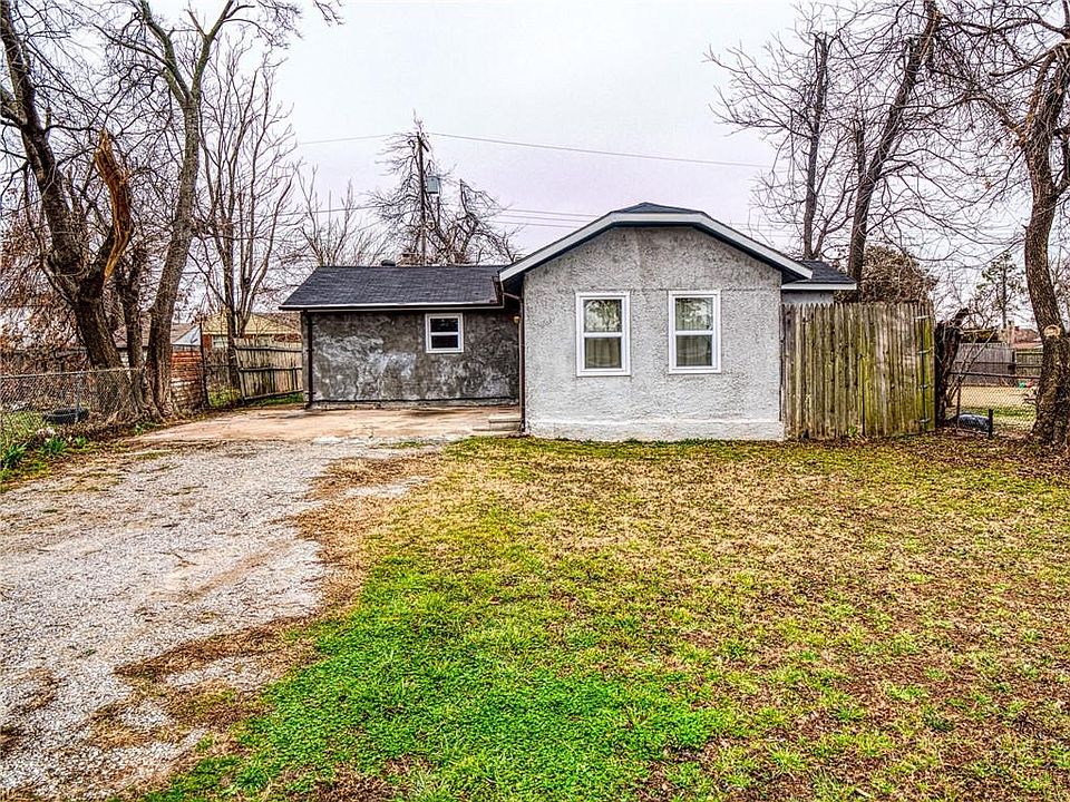 NW OKLAHOMA CITY...Remodeled...Built in 1934 Stucco siding. 910 S/F with Living Room, Kitchen, 2 Bedrooms, 1 Bath, Mud Room and inside utility. New wood look mold free vinyl laminate flooring throughout. Newer double pain windows throughout. Large 13'x12' Living Room with ceiling fan. Kitchen with eating space, painted cabinets, Granite Counter-tops, Duel Stainless Sinks with new faucet & Hardware and Vent hood. 2 Bedrooms with ceiling fans. Inside Utility room. Bathroom with Single Vanity and Shower. Separate Mud Room to enter from the back door. Wood fenced backyard with 8'x8' metal building. Close to Schools, Shopping, Restaurants and Access to I-44
