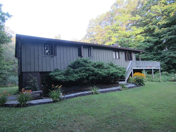 Contemporary ranch, Rhinebeck/Red Hook location.Hudson Valley ranch ideally sited on 2 acres. Surrounded by mature woods on all four sides and landscaped with flower gardens and lawn. Wonderful property for permaculture planting. Large wraparound deck to lower deck to 15x30 pool. The kitchen offers four seasons of enjoyment with a wall of windows that draw in the surrounding greenery and natural light. The kitchen features custom built solid oak cabinets and Italian porcelain tile flooring. The sky lit living room is open to the kitchen area with a post and beam open center wall. The room has a natural stone fireplace to the vaulted ceiling. The floor is ash hardwood. Sliding doors open to the deck and pool area. The dining area is open to the kitchen near the wall of windows. The master suite contains approximately 500 s.f. and has a full bath with sky lit 2-person whirlpool tub. Ceramic tile flooring and tub surround. The bedroom has a sliding glass door to the wraparound deck and pool area. The additional bedrooms are good size and are served by the hallway bathroom. The basement has a 2-car built-in garage with new energy efficient doors and automatic openers. The 288 s.f. finished portion of the basement is a family/media/gaming room with pine flooring. The remainder is approximately a 600 s.f. workshop/storage area with plenty of windows.
