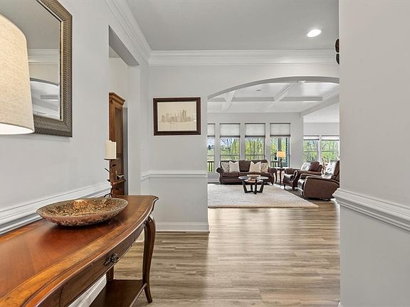 This stunning Carolina Place ranch home has 3 BR, 2 full BA with so many extras. Grand entry w/upgraded LVT flooring and coffered 9' ceilings in family room. Kitchen feat recessed lights, soaring white kitchen cabinetry w/under cabinet lighting, SS appl, leathered quartzite counters, shiny subway tile backsplash & walk-in pantry. Moen faucets,upgraded disposal. Bright morning room for meals or gatherings that opens onto the maintenance-free covered porch w/views of lush green trees. Beautiful owner's suite w/tray ceiling has 2 closets, spa-like bath w/LVT, dual vanities, large walk-in shower &private water closet. Two more roomy BR's, one can be an office space! Both have abundant closet space, ceiling fans &pristine carpeting. Immaculate 2-car garage has extra insulation & stationery tub.Widened driveway.Added concrete walkway around home showcases the impeccably kept landscaping. Walk out massive lower level is plumbed for full bath. Added radon & sec system. This home is clean!