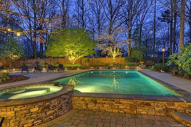 Impressive curb appeal, gracious & charming interior & a backyard paradise! A well-designed floor plan w/room for everyone & everything. A welcoming entrance opens to formal areas; guest BR on main level, den w/over-sized stone fireplace w/projector & motorized screen for your favorite movies; a great room w/cathedral ceiling, well-equipped kitchen w/high end appliances; hearth-warmed breakfast room; dual staircases; sun room & lots of natural lighting from front to back. A well-appointed master suite on upper level; 3 add. spacious bedrooms; balcony overlooking the backyard oasis with a 20x40 pool, spa, stacked stone fireplace, cobblestone paving; gas lanterns with a brick wall surrounding the entire backyard - truly an enchanting retreat! A home not to be missed. See additional feature list.