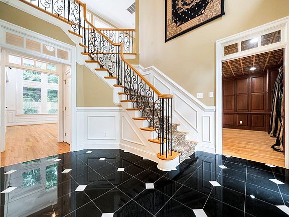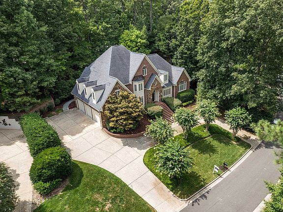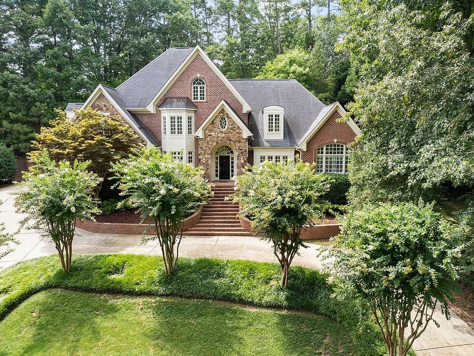 Custom executive stone/brick French country style home sits across from HOA owned wooded land and stream with view of beautiful neighborhood lake! Mahogany paneled library/study, 2-story family room with wall of windows overlooks the expansive deck and patio! Kitchen with granite, ss appliances, double ovens, island, tumbled marble backsplash and abundant cabinet space is open to the family room. HUGE main level master suite. Massive unfinished attic! Tankless water heater-less than 3 years new.